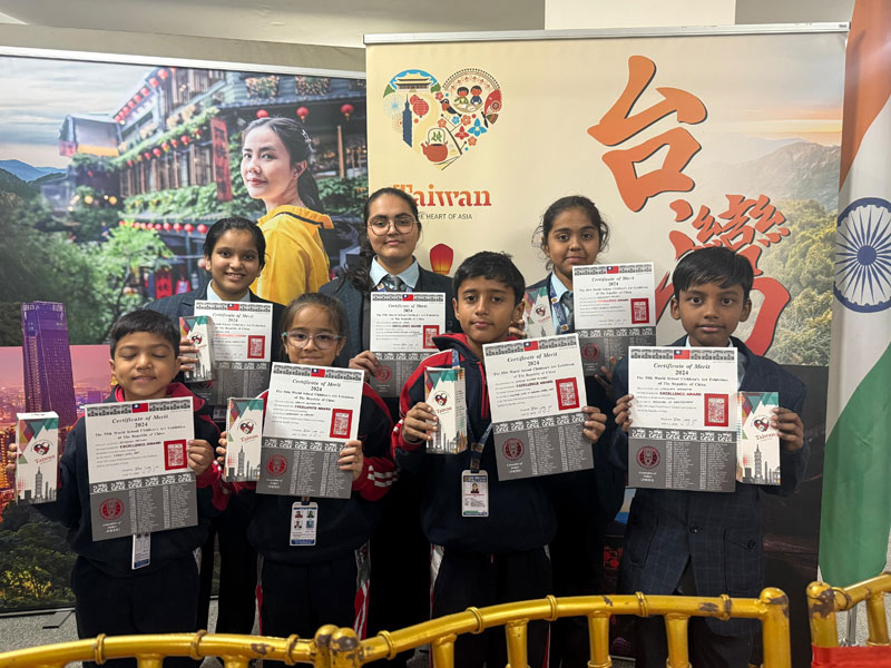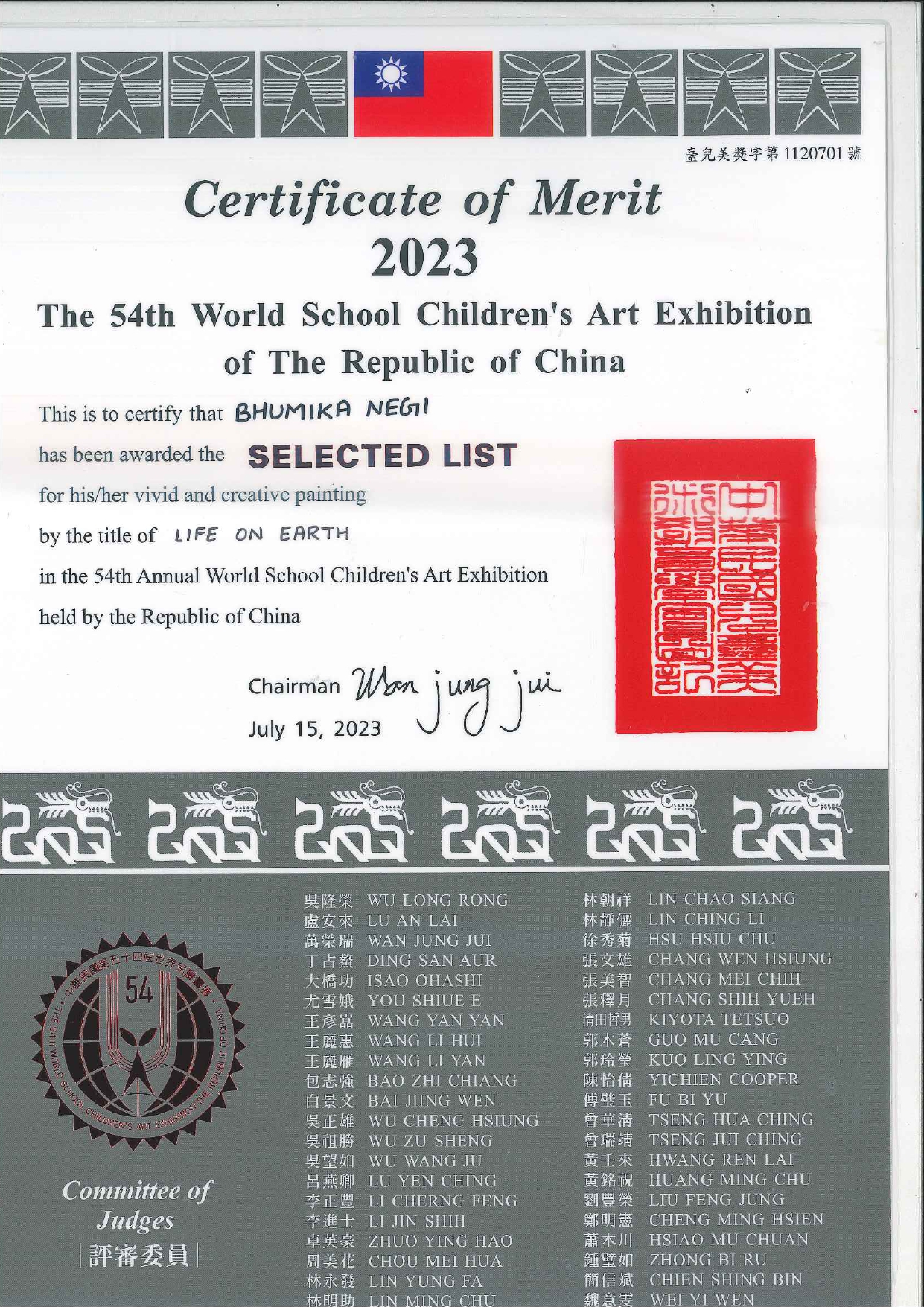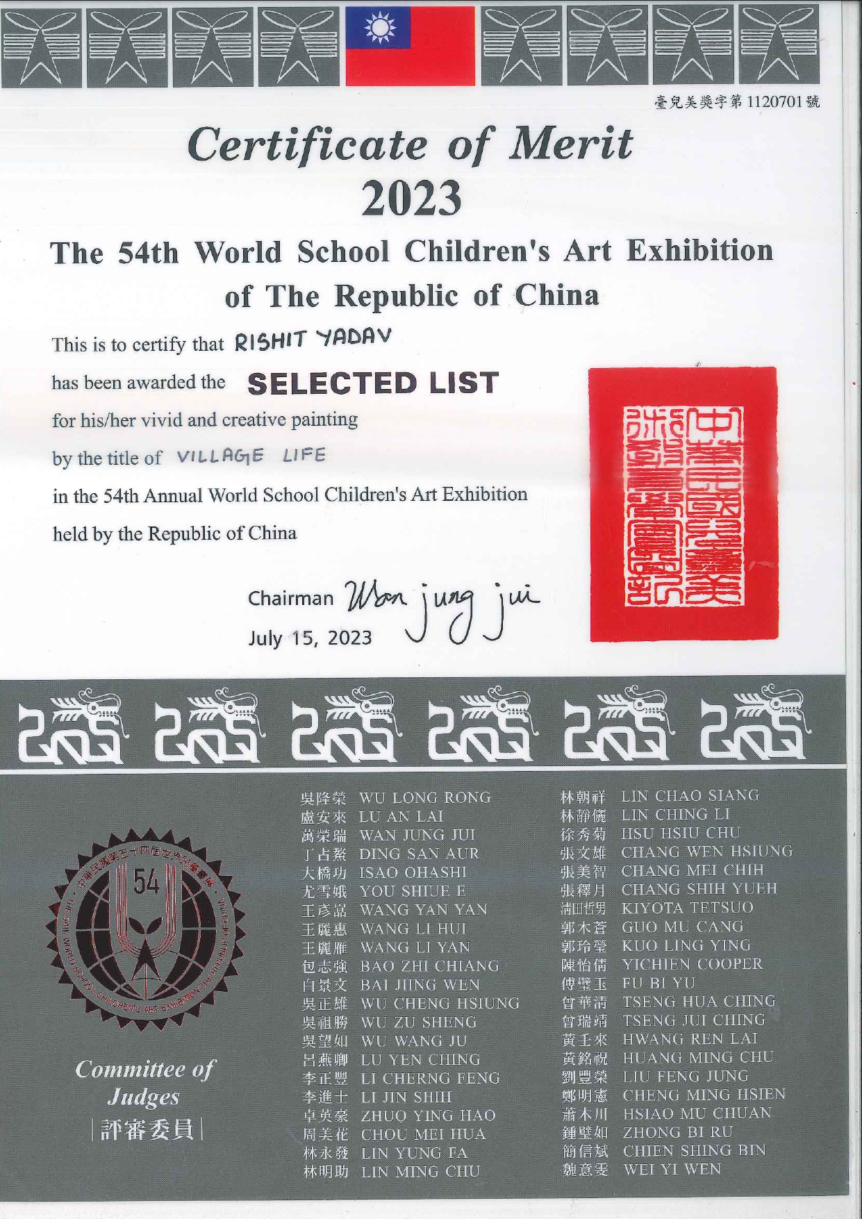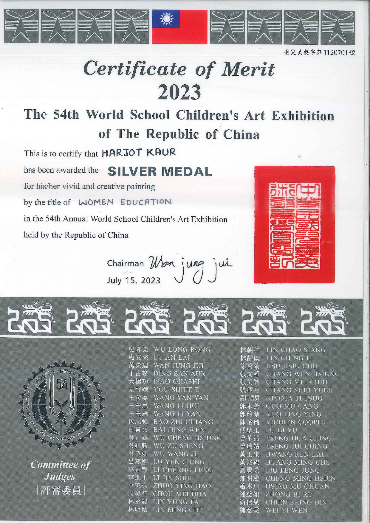 Brimming with immense joy and pride, we are elated to announce that our students participated in The 54th World School Children's Art exhibition organised by Taiwan Embassy in the month of March-2023, an international level Art Contest, and the art work of 4 of our budding artists was recognised. Harjot Kaur won a silver medal for her painting titled "Women Education". Paintings by Rishit Yadav, Dhanvi and Bhumika Negi made it to the selected list of best works of art. We Congratulate our talented artists and hope for many more similar accolades at the global level.