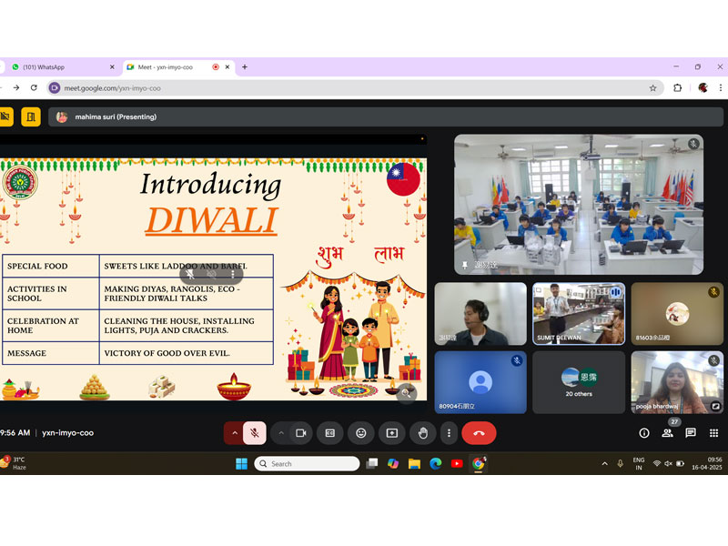 Some glimpses from the interactive Greet Session with students and teachers of our Partner School Taichung Beixin Junior High School, Taiwan. It was a delightful learning experience for our students being part of the session. Students from both schools shared information about the culture and tradition in their respective countries and also shared their feelings of love and pride for the school. The interaction was fruitful and culminated with exchange of Diwali greetings.