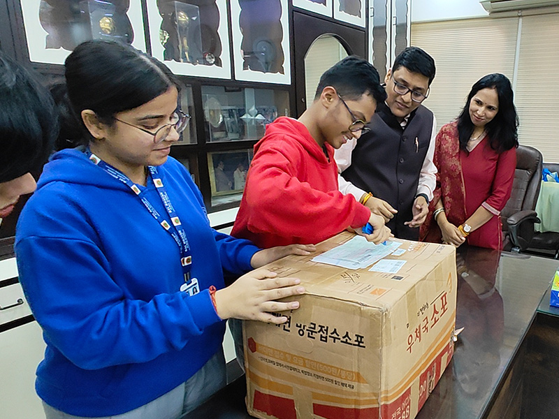 Setting foot into international terrain, we saw our enthusiastic Bal Bhavanites participate in a one-of-a-kind “Cultural Box Exchange” with Shinsung High School ,Seoul, South Korea, headed by the Principal Mr. Cho Dongho. The activity had the students of our school exchange culturally representative souvenirs with the South Korean School, which was opened amidst a lot of enthusiasm . It contained amongst other items , personalised post cards written to our students from their South Korean counterparts ! The cultural box acted as a bridge to connect our wide eyed children with a diverse culture and enhance their knowledge!